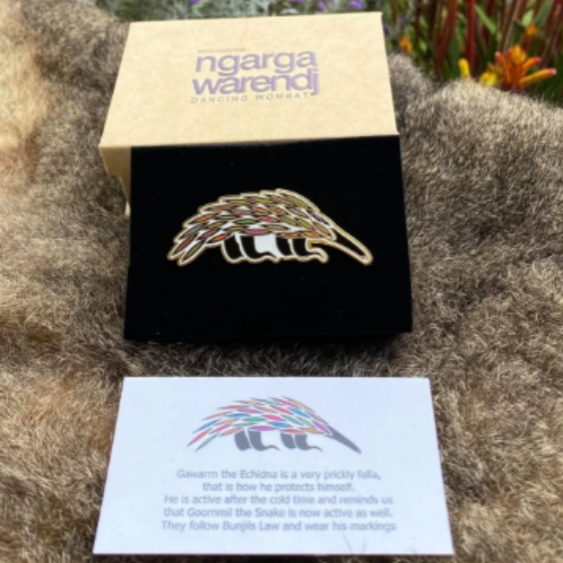 A premium Indigenous art lapel pin featuring an Echidna design by Ngarga Warendj. Gift-ready, meaningful, and inspired by South-East Australian Aboriginal country and culture.
